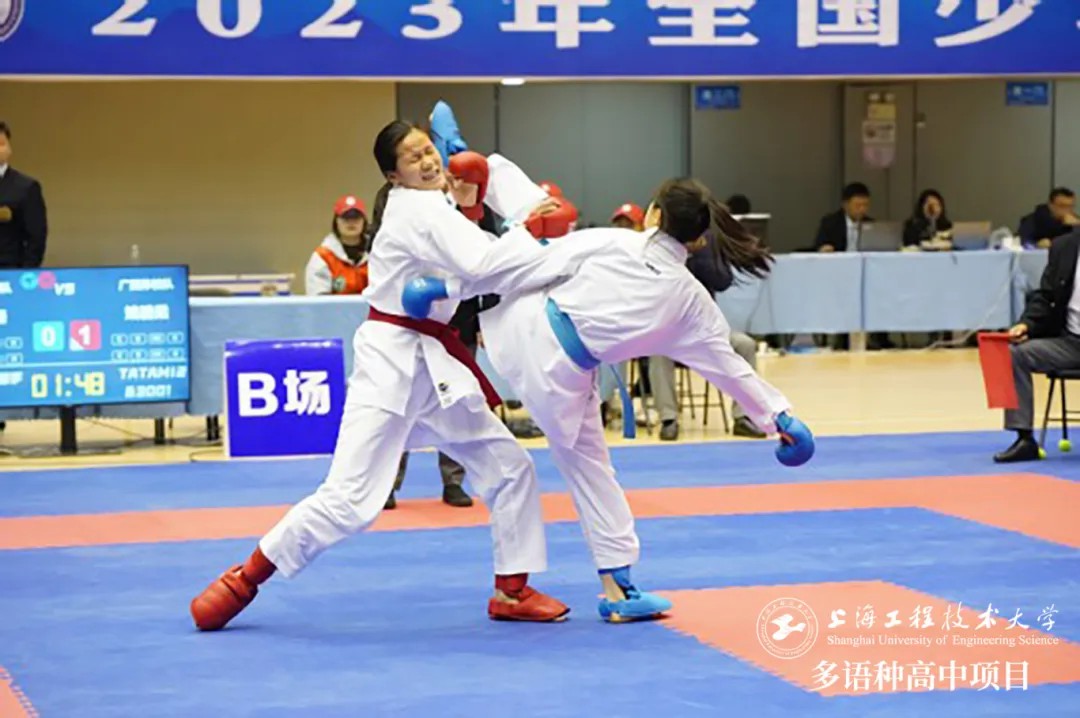 在刚刚结束的2025-2026学年上海市中小学生空手道锦标赛上,我校2025级高一日语班罗卿格同学,凭借沉着稳定的发挥和出色的技术表现,在强手如林的赛场上脱颖而出,勇夺“高中女子组个人型”项目第一名,充分展现了多语种高中项目学子文武兼修、全面发展的卓越风采。