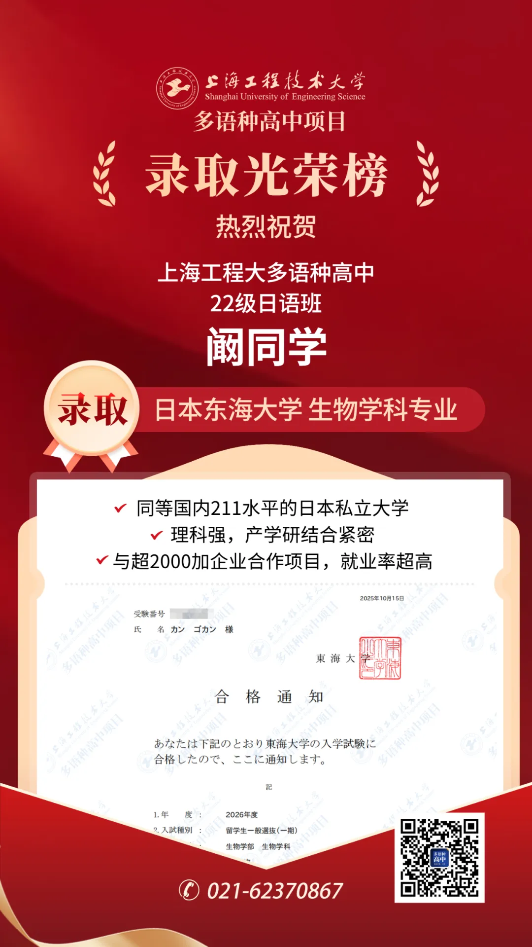 恭喜阚同学录取日本东海大学生物学科专业